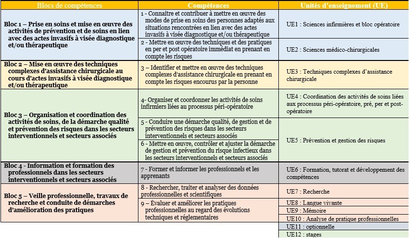Durant les 2 années de formation, 9 compétences sont à acquérir pour l’obtention du D.E. Les Unités d’Enseignement dispensées à l’Institut sont en lien avec les compétences attendues.